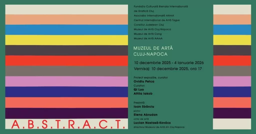Muzeul de Artă Cluj-Napoca, instituție publică de interes județean, care funcționează sub autoritatea Consiliului Județean Cluj, vă invită să vizitați, în perioada 10 decembrie 2025 – 4 ianuarie 2026, expoziția „A.B.S.T.R.A.C.T.”. Vernisajul va avea loc în data de 10 decembrie 2025, de la ora 17:00. Expoziția va fi deschisă de artistul Ioan Sbârciu, criticul de artă Elena Abrudan, Lucian Nastasă-Kovács, managerul Muzeului de Artă Cluj-Napoca, și curatorii expoziției – Ovidiu Petca și Iakob Attila.