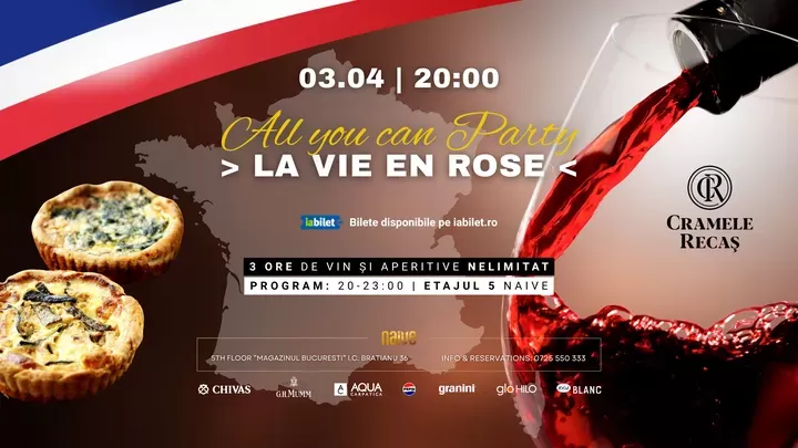 Plătești o taxă unică și, timp de 3 ore, te bucuri de vinuri de la Cramele Recaș, cocktailuri rosé și aperitive franțuzești nelimitate, într-o atmosferă elegantă și relaxată.