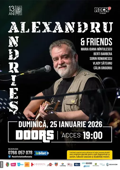 Iubitorii muzicii folk sunt rugaţi să nu lipsească la concertul caritabil susţinut de Alexandru Andrieş & Friends, duminică 25 ianuarie 2026, orele 19.00, în Club Doors Constanţa.Promitem că va fi o seară plină de muzică bună, melodii care ne vin în minte la tot pasul,care vă vor răpi un zâmbet, o să cântaţi si o să deveniţi melancolici.Alexandru Andrieș este un cântăreț de blues / jazz / folk, arhitect, scriitor, poet, traducător, pictor și grafician.