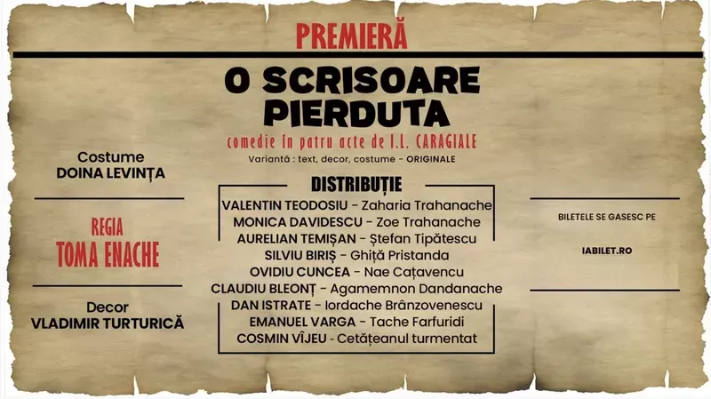 „O scrisoare pierdută” de I.L. Caragiale, piatra de temelie a comediei românești, renaște pe scenă într-o montare care păstrează cu sfințenie spiritul original al capodoperei. Această premieră nu aduce modernizări, reinterpretări sau artificii contemporane: decorurile, costumele și atmosfera sunt redate cu aceeași noblețe și autenticitate care au fascinat generații întregi.