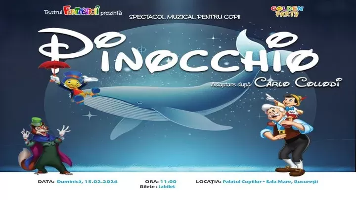 Va invităm și vă așteaptăm la o călătorie plină de peripeții și aventuri, puse într-un spectacol muzical cu actori, păpuși și mascote care îți vor spune o poveste cu tâlc - Pinocchio.