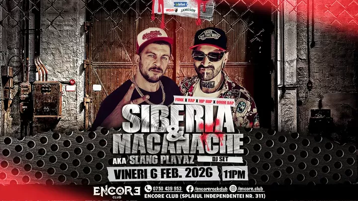 - Ce auzim? Cel mai fin Funk combinat cu Rap de scoala veche si noua.- Cine da tonul? Slang Playaz (Sibera & Macanache)- Unde? Encore Club (Splaiul Independentei 311)- Cand? 6 februarie 2023, ora 23:00