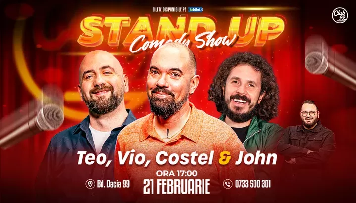 Vă așteptăm la o seară de stand-up comedy alături de Teo, Vio, Costel - John