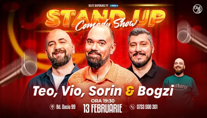 Vă așteptăm la o seară de stand-up comedy alături de Teo, Vio, Sorin Pârcălab - Bogzi