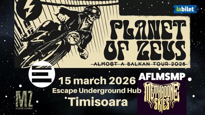 M2 Events presents Planet of Zeus almost Balkan Tour 2026 in Timisoara with coheadliners Methadone Skies and Am Fost La Munte si Mi-a Placut at Escape Underground Hub.